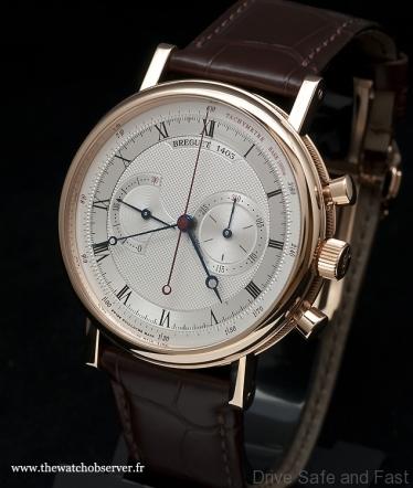 Case in 18-karat rose gold, 42.5 mm diameter, fluted caseband, welded horns, screwed bars, sapphire crystal case back. Mechanical chronograph movement with manual winding, numbered and signed Breguet, caliber 533.3, Swiss straight-line lever escapement, Breguet balance spring, frequency 3 Hz, adjusted in 6 positions. Power reserve of 48 hours. Functions: hours, minutes, small seconds, chronograph, tachometer. Dial in silvered 18-karat gold, hand-guilloché in 4 different patterns, Breguet “open-tipped apple-shaped” hands in polished steel. Leather strap, three-blade clasp. Water-resistant to 30 meters.