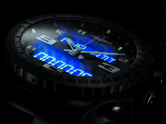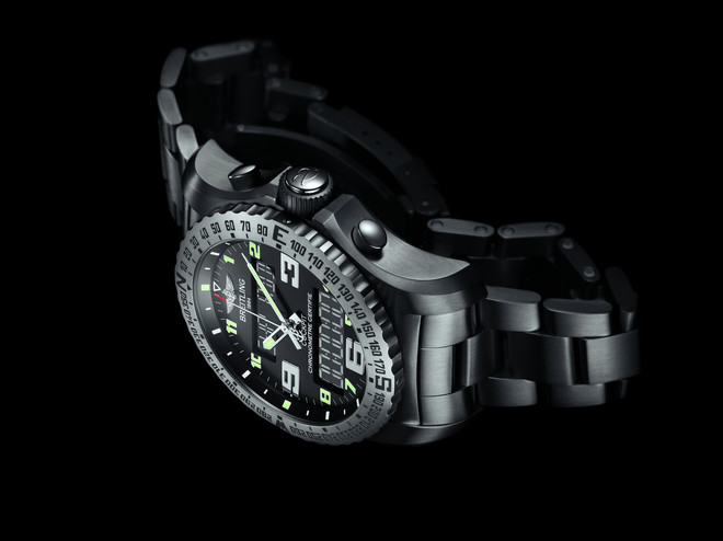 Representing the ultimate pilot’s instrument, the multifunctional electronic Cockpit B50 chronograph features a titanium case equipped with an analog and digital-display SuperQuartz™ movement specially developed for aviation by Breitling. Designed to accompany missions of all kinds, it innovates with an ultra-readable display, outstanding user-friendliness and a broad array of functions, including an electronic tachometer and a “chrono flight” device serving to record flight times while memorizing departure and arrival times as well as the date.