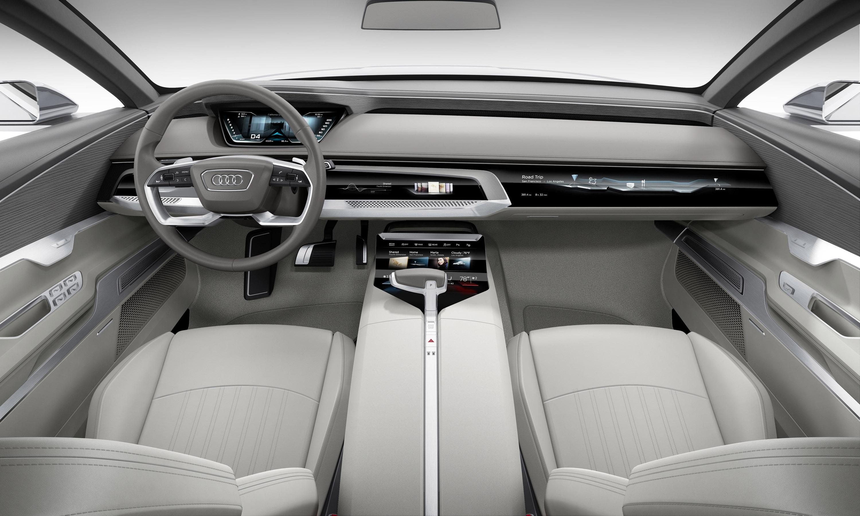 Tautly stretched lines and lean geometric forms give the interior a light and clear ambience. The instrument panel has a light and elegant appearance with its strictly horizontal layout that is not interrupted anywhere, and it emphasizes the generous interior width. It lowers itself towards the interior on two levels. The upper level is positioned, like a roof, above the Audi virtual cockpit future – an advanced development of the Audi virtual cockpit – and above the line of air vents. It is part of the wrap-around – a large arc that encircles the driver and front passenger.