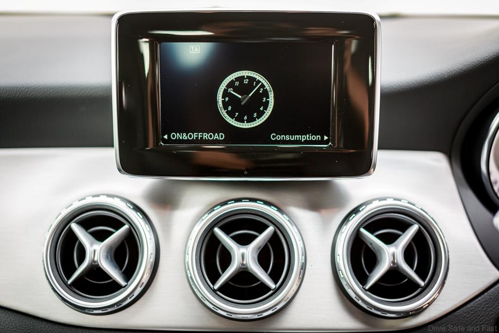 Five round air vents are integrated into the dashboard. As an exclusive GLA feature, bezels are available around these circular vents echo the SUV-look of the skid plate and side sill panels. The direction of the airflow can be varied by butterfly-shaped inserts.
