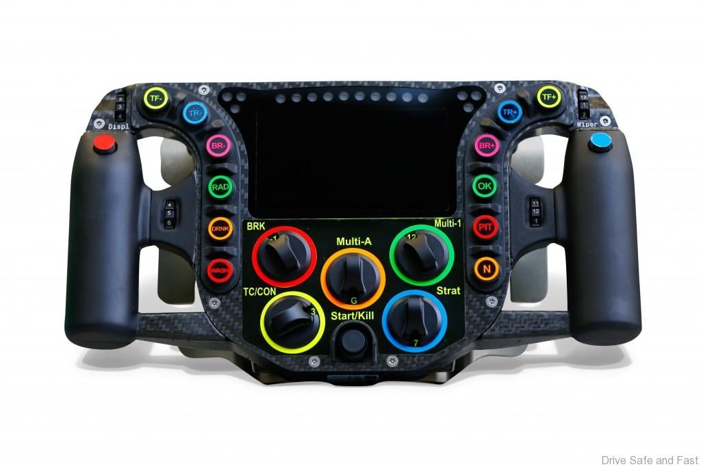 The orange buttons further down operate the drinking system (on left) and put the transmission in neutral (on right). The red button at the bottom left is for the windscreen washer, the red one on the right side activates the cruise control to restrict the speed in the pit lane.