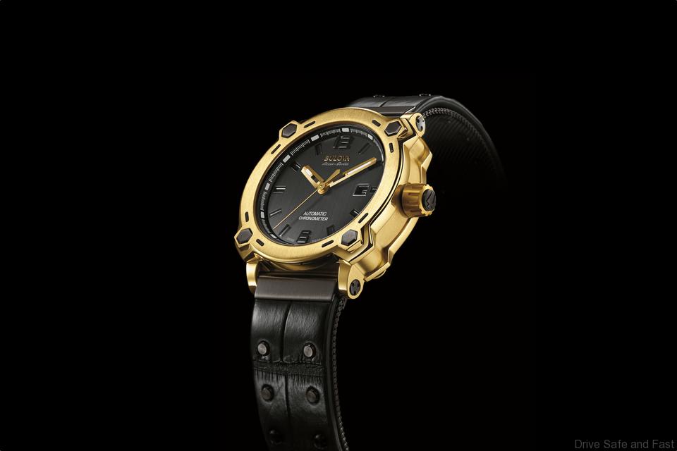 The Bulova 24K Limited Edition wristwatch comes with a sapphire glass that has a 5 layer anti-glare treatment, a screw down caseback and is water-resistant to 30 meters. It is paired with a proprietary two-layer black alligator leather strap that also has a layer consisting of a 316L stainless steel mesh bracelet with three microns of black titanium carbide. The two layers are fixed together with a series of grade-5 titanium rivets designed to slip within the mesh to maximize flexibility and comfort.