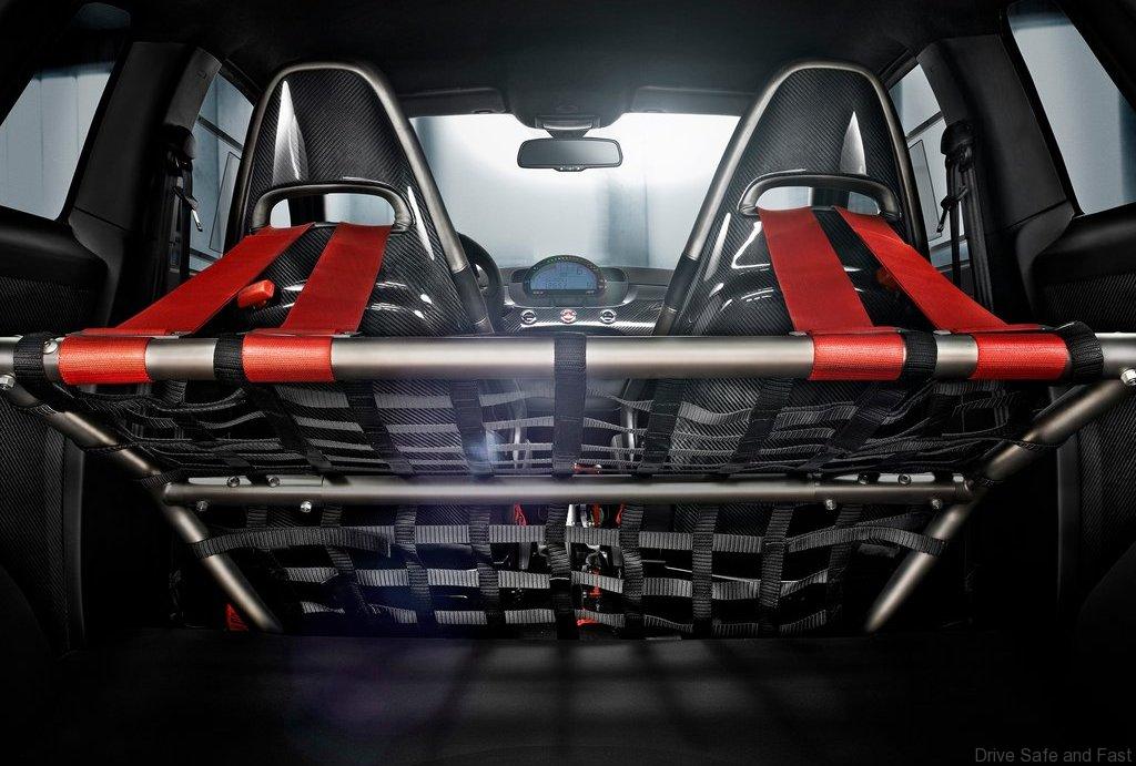 The mark of Sabelt is also to be found on the anatomical seats: they’re “Abarth Corsa by Sabelt” with composite or carbon fibre shell, with upholstery comprising electro-welded Alcantara and titanium-coloured leather with brand-new colours and finishes for an Abarth.