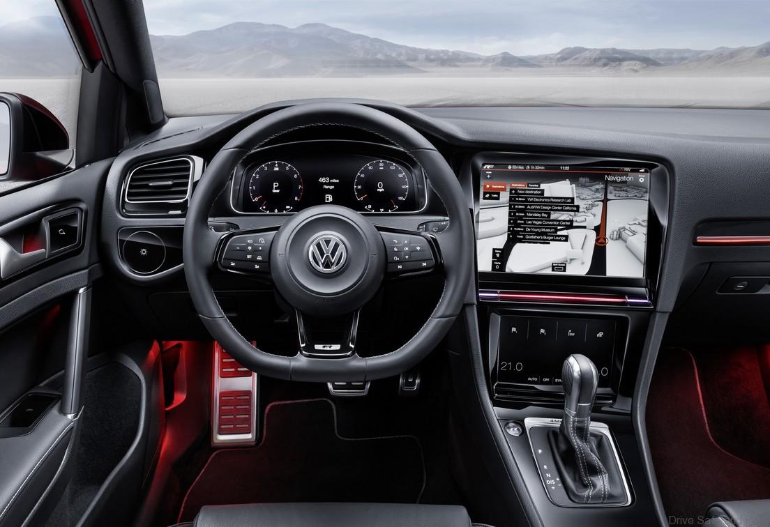 Switch-free operation. The development team for the Golf R Touch pursued the goal of developing an interior and infotainment concept that would fulfill seemingly contradictory requirements. Despite continually growing complexity and numbers of functions, this concept was intended to reduce driver distractions while attaining a maximum of personalization and intuitive operation in the car. A vehicle was created in which nearly all controls are implemented via touchscreens and touchpads – a nearly switch-free cockpit. The Golf R Touch is equipped with three displays: the 12.8-inch touchscreen of the infotainment system (resolution: 2,560 x 1,700 pixels), a Control Center (8.0-inch with touch feedback) located beneath it for vehicle, climate control and media functions (resolution: 800 x 480 pixels) and an Active Info Display (digitalized instruments) in 12.3-inch format (resolution: 1,920 x 720 pixels).