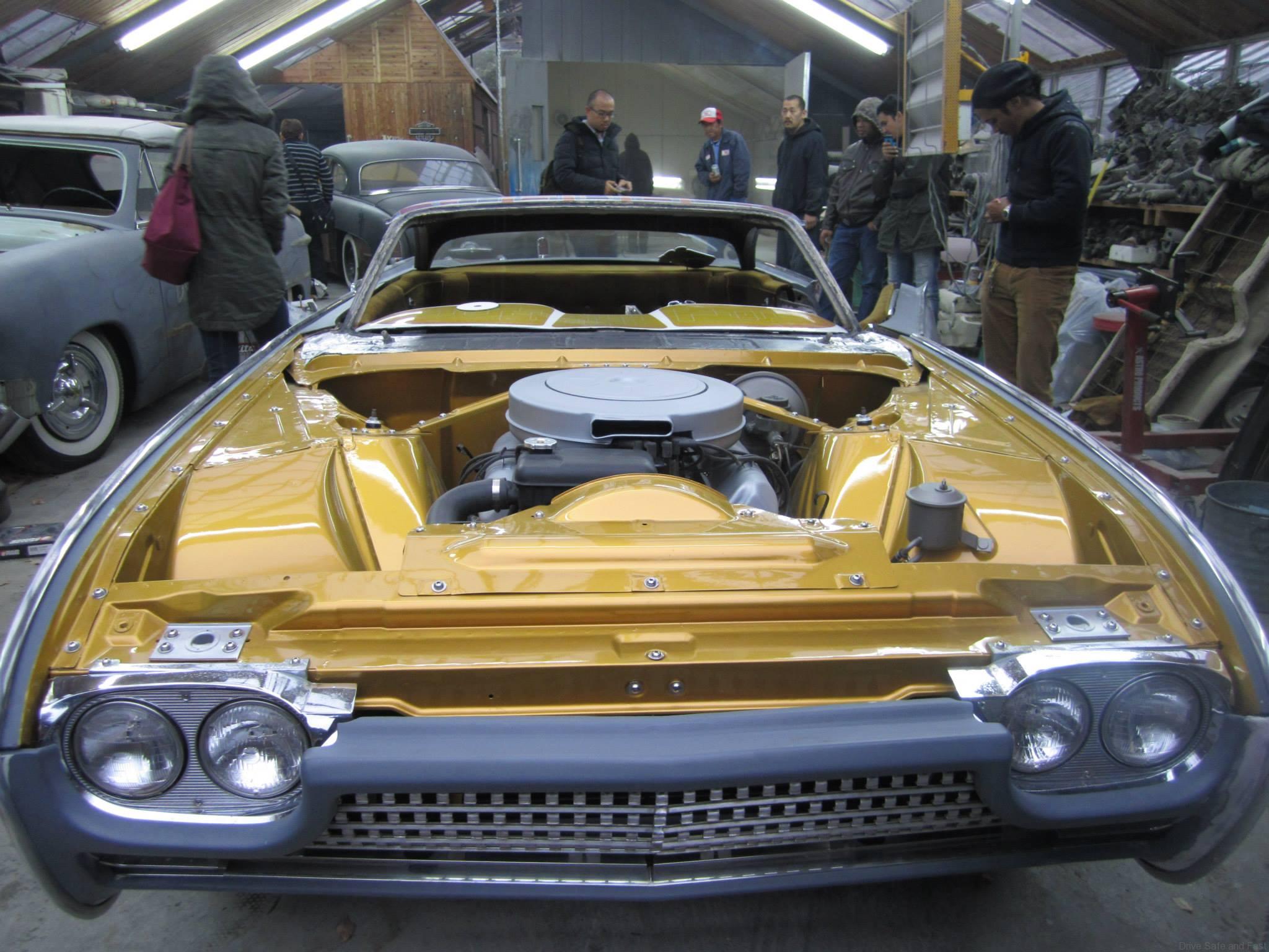 Last garage visit for all of us was Blues Mobile Speed Shop owned by Takeshi Watanabe located at Tsuzuki-ku, Yokohama. It was about 3 pm and it started to drizzle a bit. This workshop is located uphill and the bus driver parked our bus at a small alley. We took a very nice walk up to his workshop. The view was very nice. We saw organic farm by the hillside and very surprised that there is a hidden barn with all American cars stored outside & inside Blues Mobile Speed Shop. Takeshi-san was really surprised with our visit and welcomed us. His team was also finishing a 3rd generation Ford Thunderbird for the Hot Rod Custom Show. The team had two more days to finish the car! We also took a walk near his shop and saw lot more American cars parked over there. Such a perfect view in nice weather.
