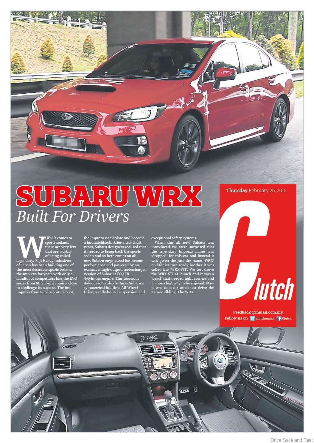 In you Malay Mail newspaper this morning, Clutch motoring supplement has the latest car, truck and motorcycle news. We test drive the all new Subaru WRX and explain why we do not need the WRX STI in our garage….just the WRX will do nicely.