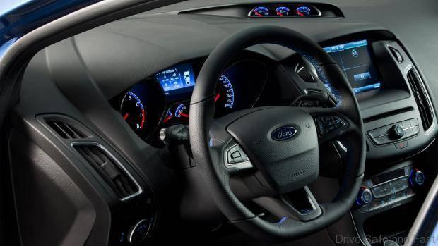 The interior features the reworked Focus control layout with its simpler, more intuitive design. SYNC connectivity provides access to audio, navigation, climate control and mobile phones via voice control, and via a high-definition, 8-inch color touch screen. SYNC can be specified with rear view camera with park distance control, as well as a Sony premium sound system with 10-speakers including a subwoofer. The RS driving experience is reinforced by a new flat-bottomed steering wheel with a soft-feel leather-covered rim, alloy pedals and unique instrument graphics within the main cluster. An additional bank of gauges above the center console displays turbocharger boost pressure, oil temperature and oil pressure.