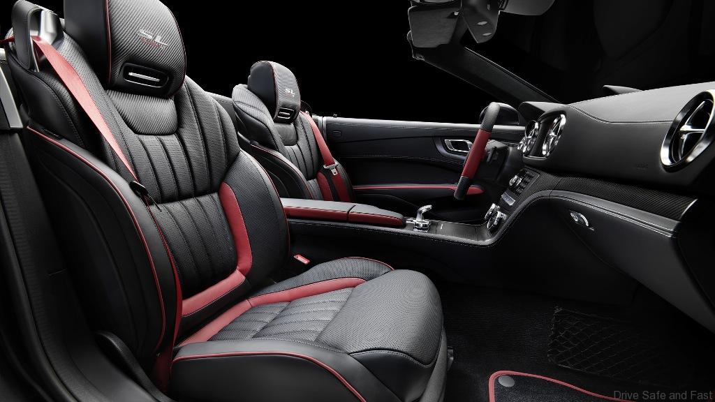 Mercedes-Benz has further upgraded the luxurious yet sporty interior with fine materials and meticulous master craftsmanship. The AMG Line seats as well as the black centre console with contrasting inlays and red edging are eye-catching features. The leather headrests sport an embossed carbon structure and an embroidered “SL Mille Miglia” label. Red edging also outlines the black door centre panels with red armrests. The easy-to-grip steering wheel is wrapped in red and black nappa leather with sporty embossed carbon structure and bolsters the sporty ambience. The trim elements have a matte carbon finish. The black floor mats with red edging sport an embroidered “1000 Miglia” label.