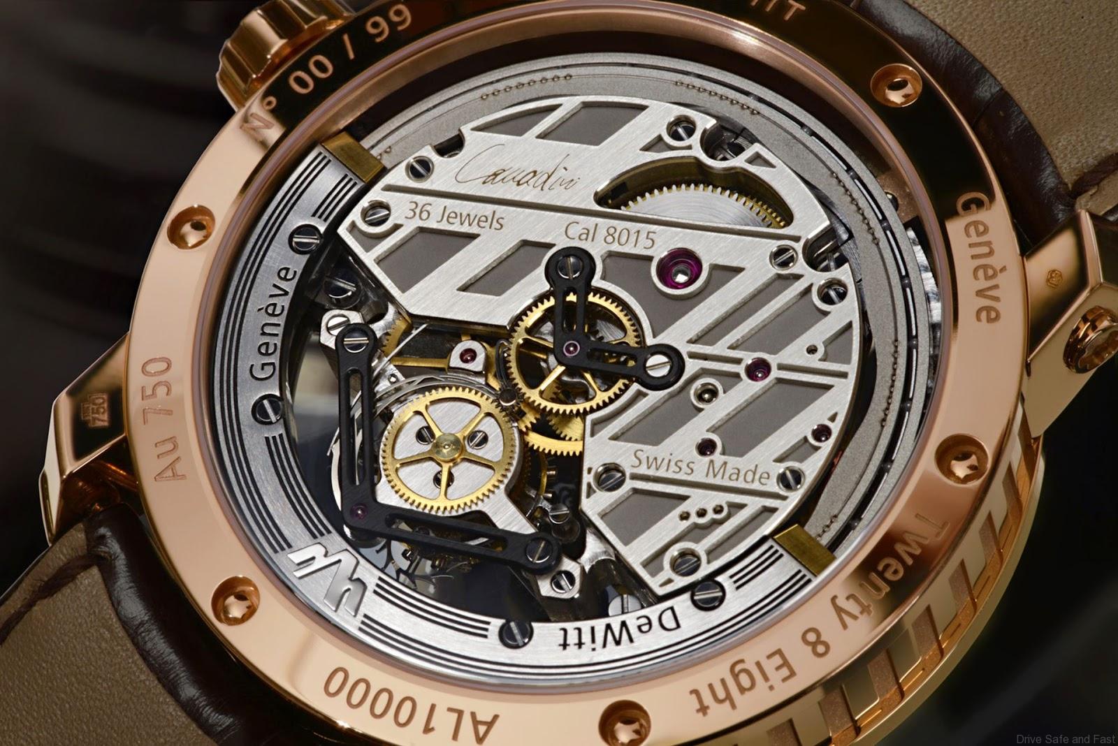 DeWitt unveils two new versions of the Twenty-8-Eight Tourbillon Prestige. It houses the calibre DW 8015, developed from the DW 8014 movement that was first presented in 2010. This automatic Tourbillon introduces a patented and extremely ingenious Automatic Sequential Winding (A.S.W) device, driven by a peripheral oscillating rotor.