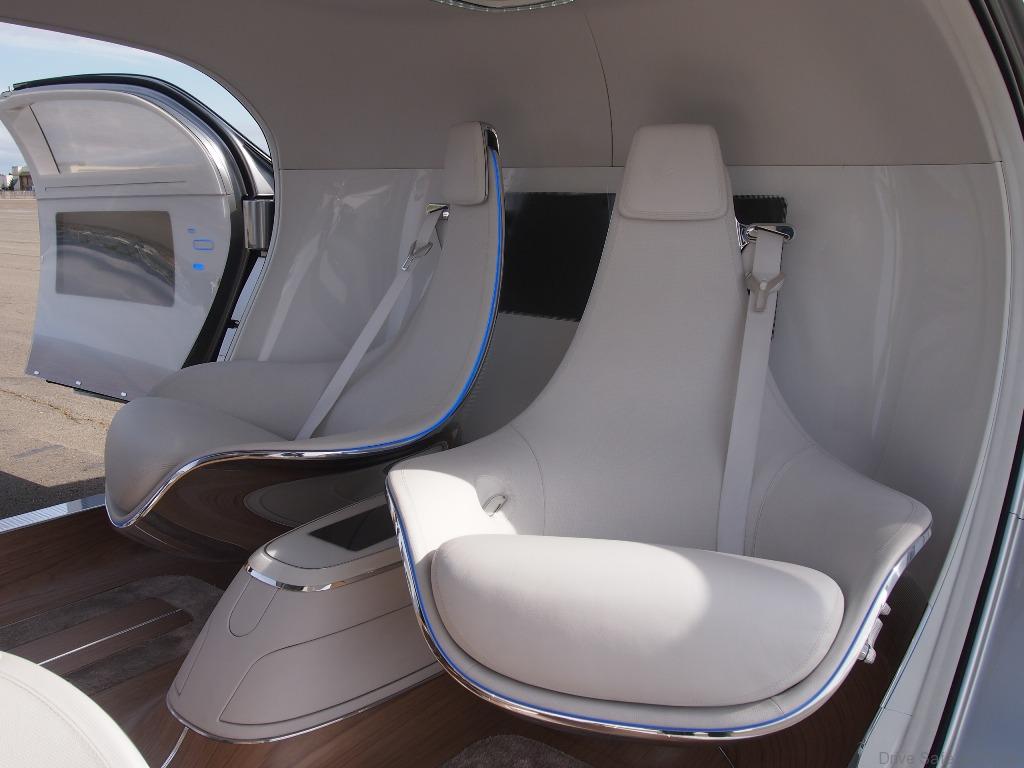 On the inside you find 4 seats from Star Trek. The seats are surprisingly comfortable despite its look and offer full swivel function to allow all passengers to face each other while on the move. There is a steering wheel and two foot pedals for the driver to take over when needed. Each passenger can take control of the cars functions with the use of the touch screens on each door.