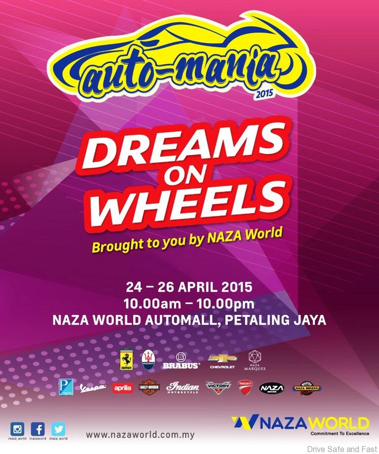 Motoring enthusiasts are welcome to visit the three-day NAZA World Auto-Mania showcase which is open to public from 10:00AM to 10:00PM, from Friday, 24th April 2015 to Sunday, 26th April 2015. It is held at the NAZA World Automall in Petaling Jaya which is visible and accessible from the Federal Highway.