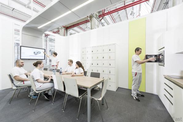 In conjunction with the Rosenheim University of Applied Sciences, Audi has started to implement redesigned lounges and group corners in their Ingolstadt and Neckarsulm production facilities. These new redesigned areas are aimed at improving how employees take their breaks, being closer to the production line and reducing downtime. The units are built to be modular and flexible, allowing for multiple configurations with multiple components and materials.