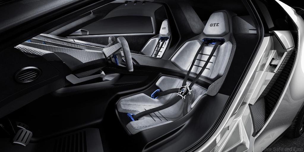 Two-seater race car. The driver and passenger board the two-seater interior of the Golf GTE Sport through doors that swing right up in the style of the XL 1. The doors extend a long way up into the roof and down into the side sills, resulting in convenient boarding when they are opened upwards. The interior in carbon and microfiber consists of two completely separate areas for the driver and passenger. Like in motorsport vehicles, they sit quite a long way to the back on racing bucket seats with five-point belts. Accordingly, the steering column that is entirely clad in carbon projects a long way into the interior where it appears to float – a further characteristic feature of a rally car or touring-car racer. The functional elements are operated via controllers and buttons in the cocoon-like interior trim. The gearbox of the Golf GTE Sport can also be operated manually with shift paddles on the motorsport steering wheel.