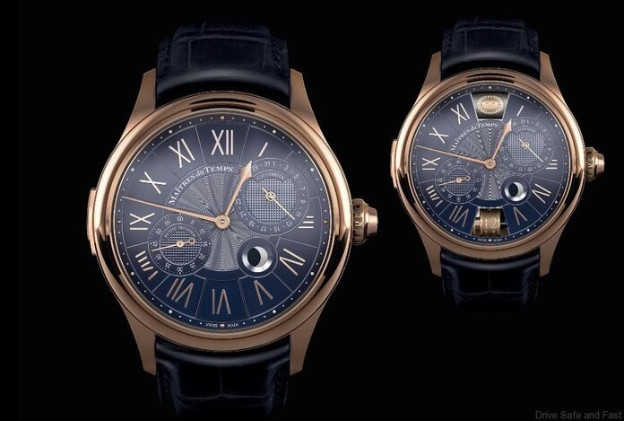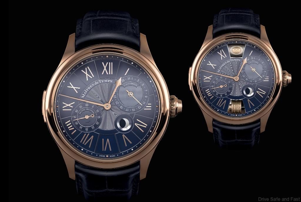 A pusher set into the crown lowers and hides two hidden panels in the dial to reveal a second time zone indicator and a day/night indicator, both displayed on Maîtres du Temps’ signature rollers. Elegant sophistication has never looked so good.