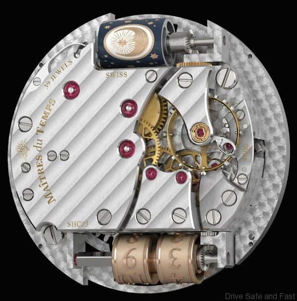 Central hours and minutes, small seconds, date, moon phase, hidden time zone on roller, hidden day/night on roller, manual winding mechanical movement