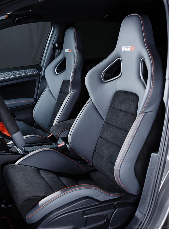 Sporty, extravagant, individual: This is how the interior of the OETTINGER 500R. The super sports car is waiting here with an exclusive leather interior with black Alcantara on the center seat panels. In keeping with the exterior, the decorative seams are individualized in the contrasting color “Orange”. Refines the racing bucket seats with integrated head restraints and harness slots, the three-spoke sports leather steering wheel and door panels, rear seat and trunk cover.