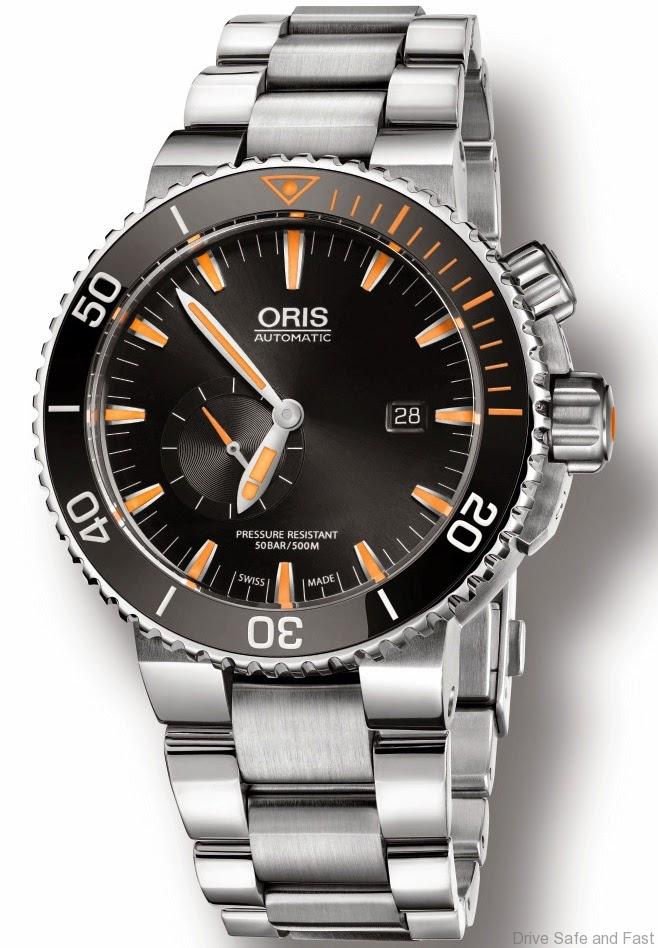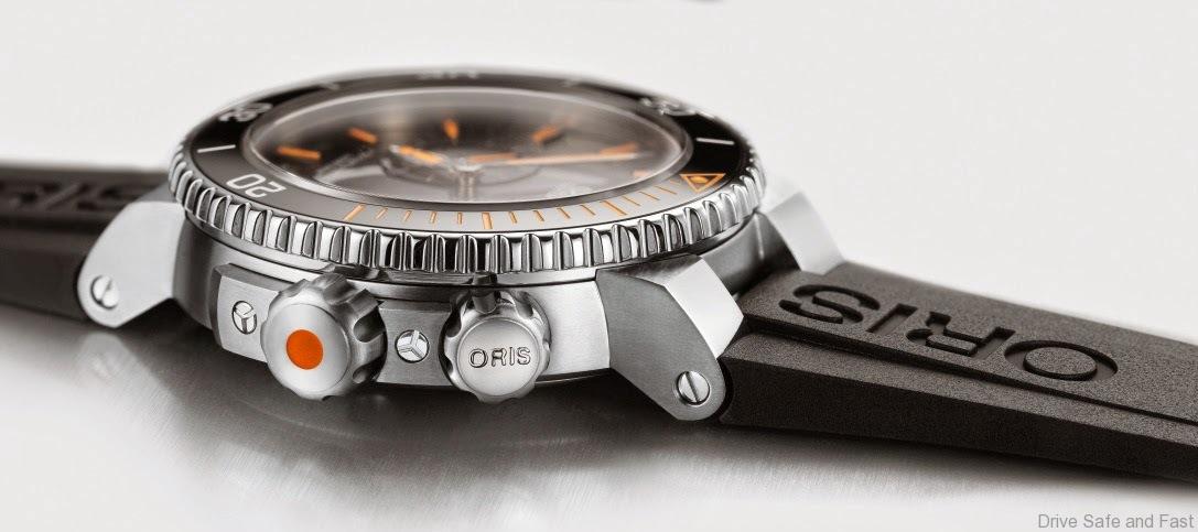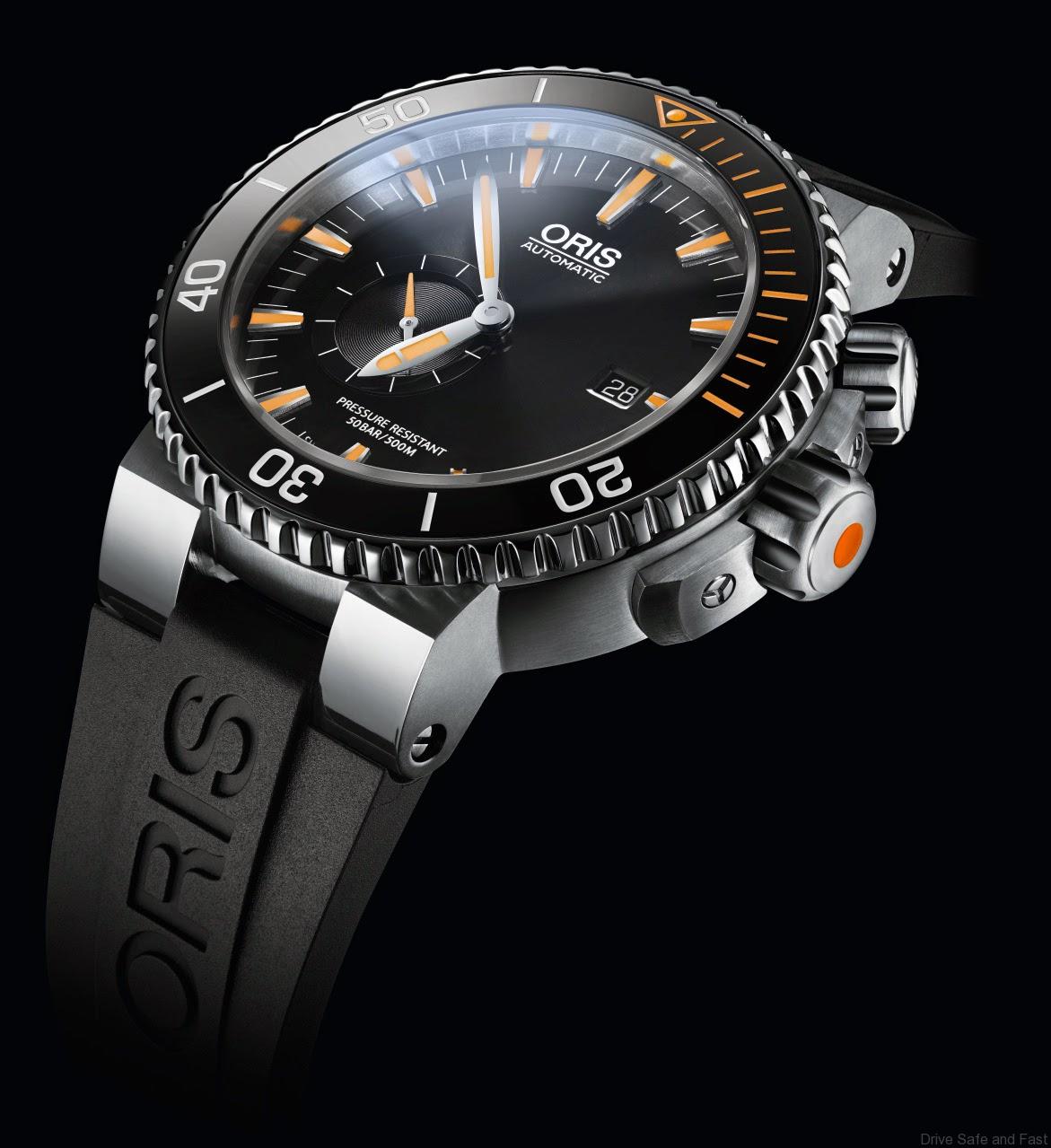 The watch comes on a black rubber strap – with the option of a titanium bracelet – which features Oris’s ingenious quick adjustment sliding-sledge folding clasp system.