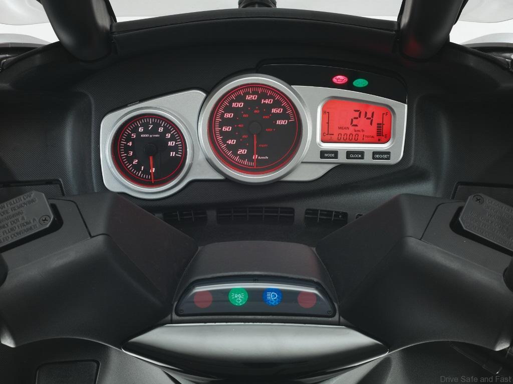 The compact but light nose holds the aesthetic dynamism of the headlight assembly: A silver coloured grille is inserted between the two lights, a simple, thin screen which gives the SR Max 300 cc an energetic expression. The graphics, which encompass the light and the air intakes, create a “contrast” with the vehicle colouring, together with the “three-coloured” scheme and are flaunted on the upper part of the shield – giving the SR Max elegance and an unmistakable style.