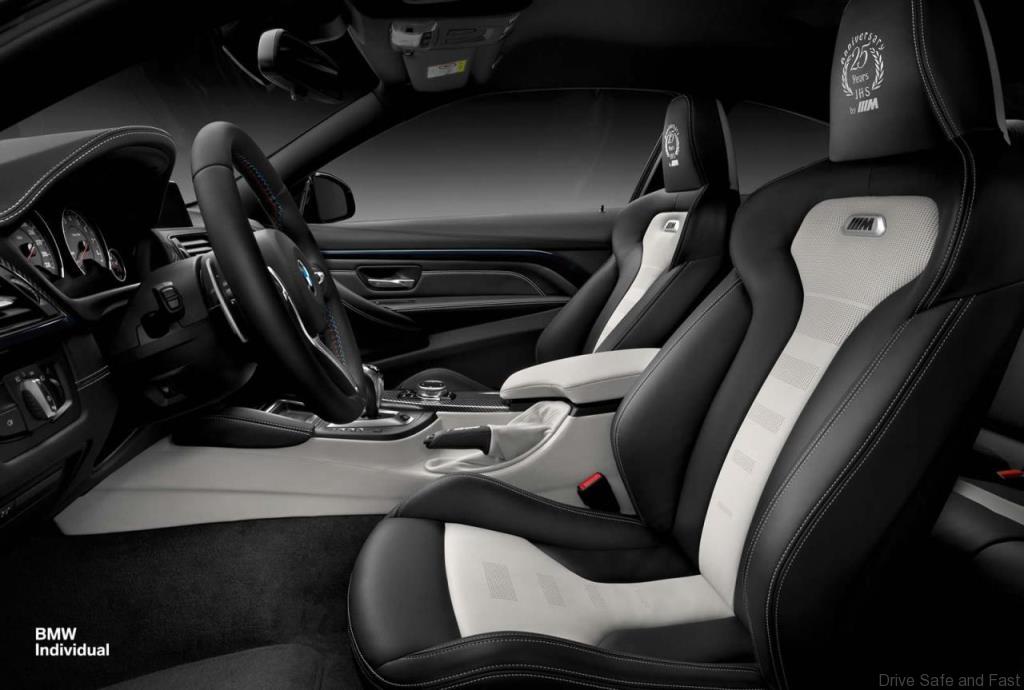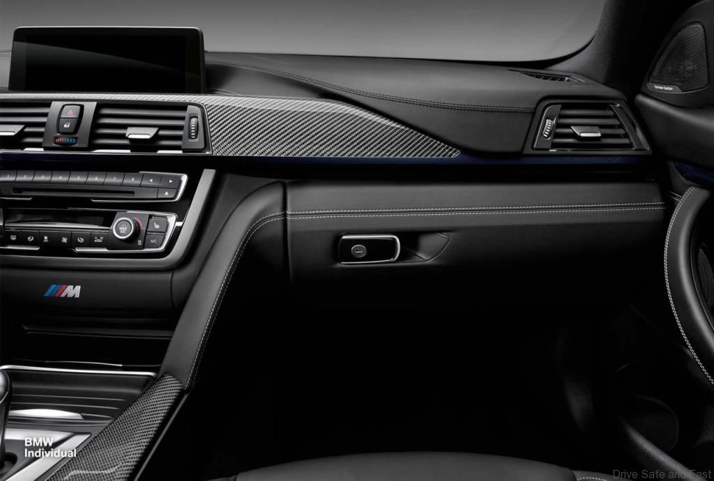 As part of BMW Individual’s 25th anniversary celebration, the division of the company dedicated to its one-offs will be releasing a very special version of their M4 Coupe. On the outside, it’s covered in a hue called Macao Blue with M striped across its carbon top and a dark finish on the front splitter.