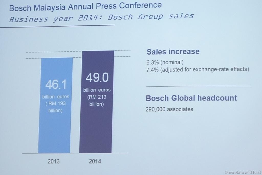 Bosch Group business outlook for 2015 The Bosch Group expects global sales to grow within an exchange rate-adjusted range of 3 to 5 percent in 2015. Speaking at the company’s recent annual press conference in Germany, the Bosch CEO Volkmar Denner said: “Our economic and technological strength in established business fields is enabling us to tap into new market segments.” Web-enabled products and internet-based services are one of the focal points of the company’s future business. “We are driving connectivity forward in all our business sectors and playing an active role in shaping it,” Denner added. In 2014, Bosch launched many new products and connected solutions, including software solutions for smart heating systems and buildings as well as for connected industry and connected mobility. With the complete acquisitions of BSH Hausgeräte GmbH and Robert Bosch Automotive Steering GmbH, Bosch has strengthened its position in the fields of smart homes and automated driving. In Asia Pacific, Bosch grew its sales 17 percent (19 percent after adjusting for exchange rate effects) in 2014 to RM 56 billion (13 billion euros). At just under 27 percent of total sales revenue, the region’s share of sales reached a new high. Sales growth was especially strong in China, rising a nominal 27 percent to RM 28 billion (6.4 billion euros). In Southeast Asia, Bosch achieved a year-on-year sales growth of around seven percent by generating RM 3 billion (672 million euros).