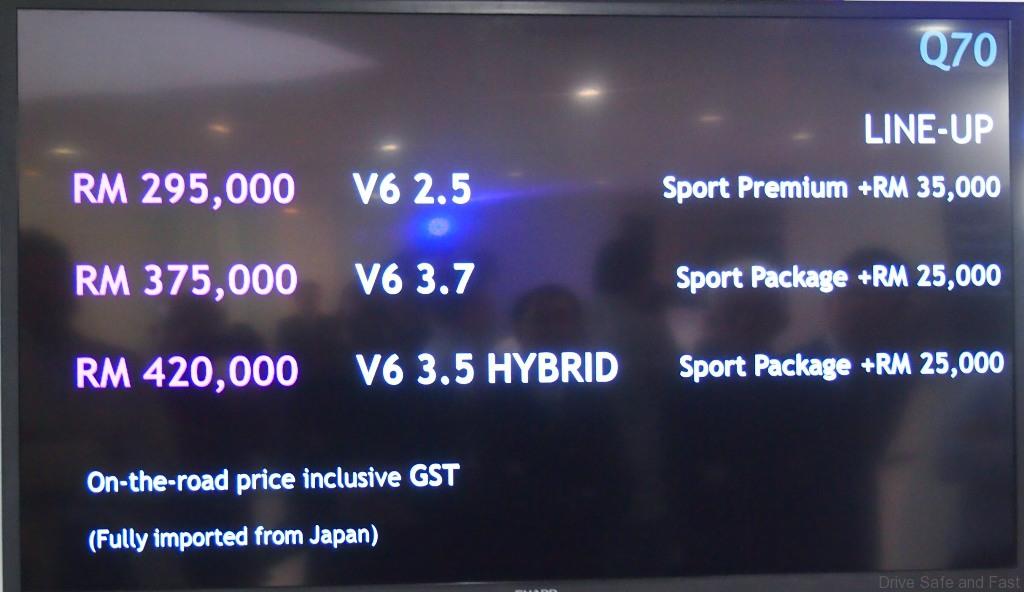 Estimated fuel economy (combined) is rated at 12.1km/L for the Q70 2.5L, 11.8km/L for Q70 3.7L and 14.5km/L for Q70 3.5L Hybrid.