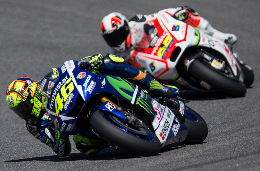 The Honda rider, who’d reverted to a 2014 frame with 2015 components, was never able to pull clear. With three laps to go Rossi moved back into the lead midway round the lap before opening a half second advantage as they began the final tour.