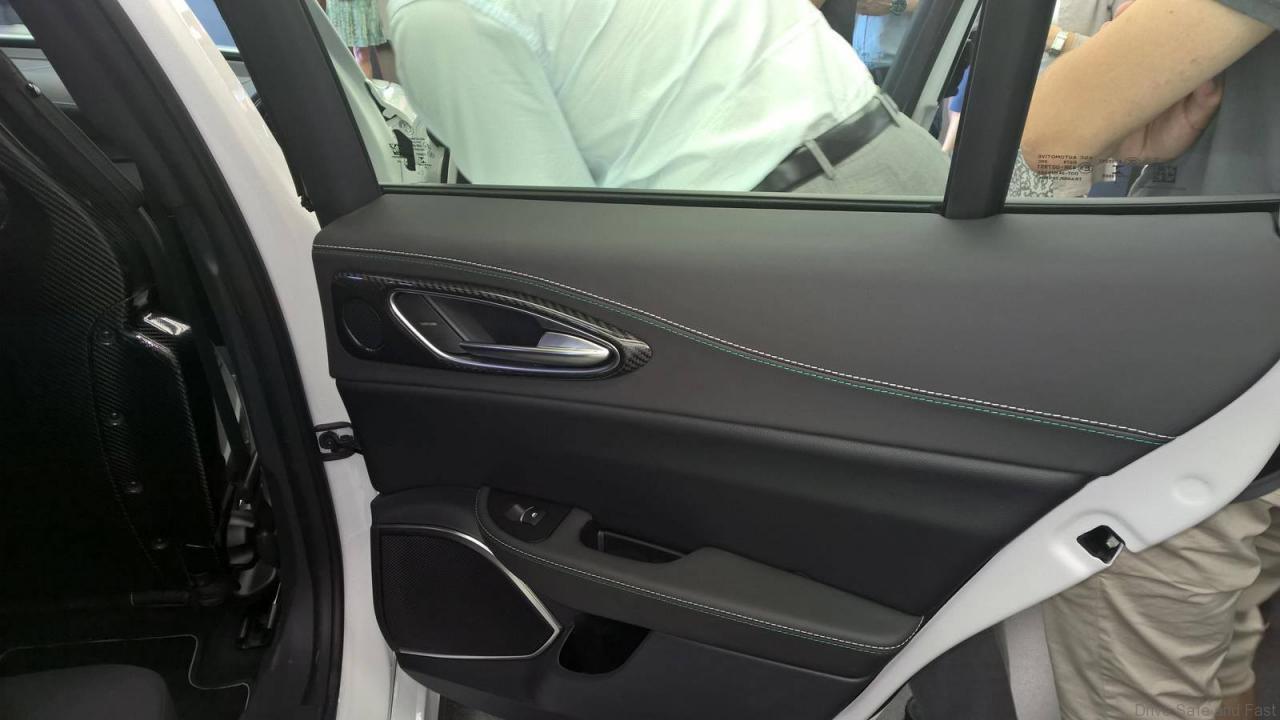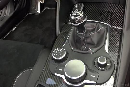 Starting with the centre console, we find gloss-finished carbon fibre trim. It’s uncertain if it’s real carbon fibre, but Alfa is unlikely to skimp in this department. The 6-speed gear shifter features a spherical knob that’s covered in a little bit more of the lightweight material and has a leather (or leatherette) cover with two-toned stitching. It also appears as if the Giulia will be housing all of its media controls down here, as is the current trend.