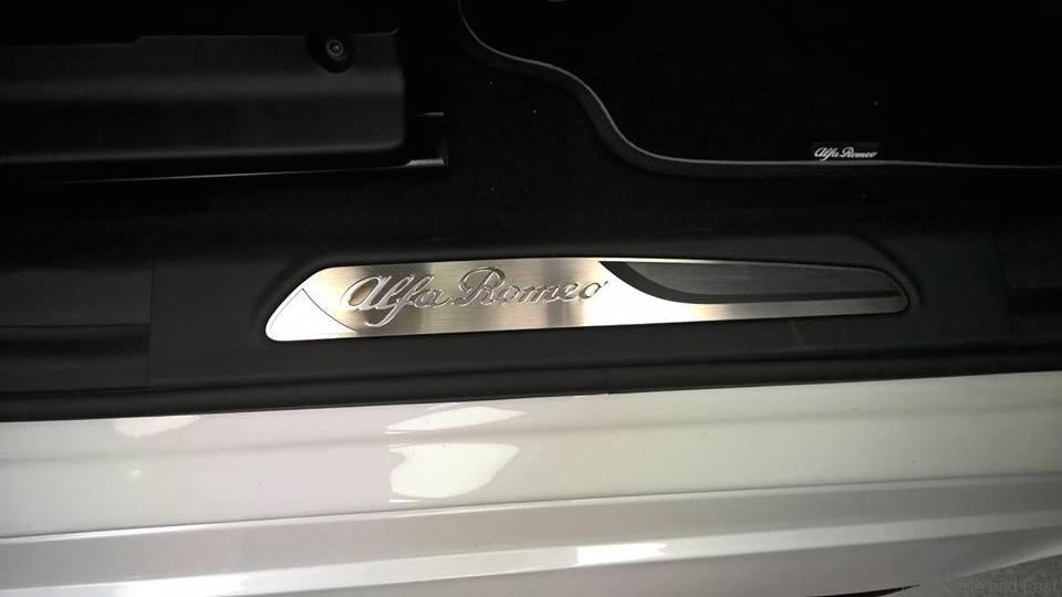 Alcantara on leather seats with the Alfa logo embossed on the headrest. Very nice.