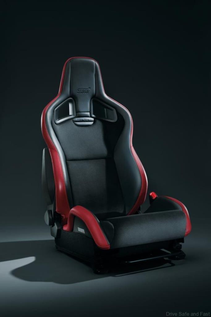 - Recaro-designed front bucket seats [black leather / black punching Alcantara® combination seats (red stitching and red accents)] with STI logo and SRS side airbag