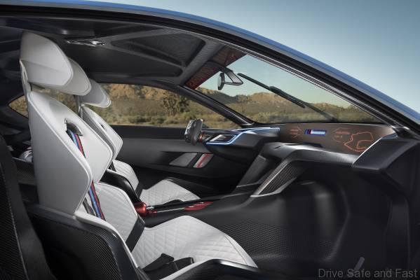 The side-section design of the large carbon-fibre seat shells reflects the anatomy of the seated driver, thus providing maximum support in any driving situation. At the same time, the seats ensure the driver’s body has the best possible connection with the car, giving him a physical feel for it with almost his whole body, in any situation, and thus allowing him to react faster and more effectively. The seat shells follow a rising diagonal path rearwards, a line extended behind the seats into the rear by a structural carbon-fibre element that increases the torsional rigidity of the BMW 3.0 CSL Hommage R. The white seat surfaces with fanned-out quilting, integrated into the seat shell, mimic the design of the driver’s race suit, while BMW Motorsport’s signature stripes on the six-point safety harness add an extra splash of colour.