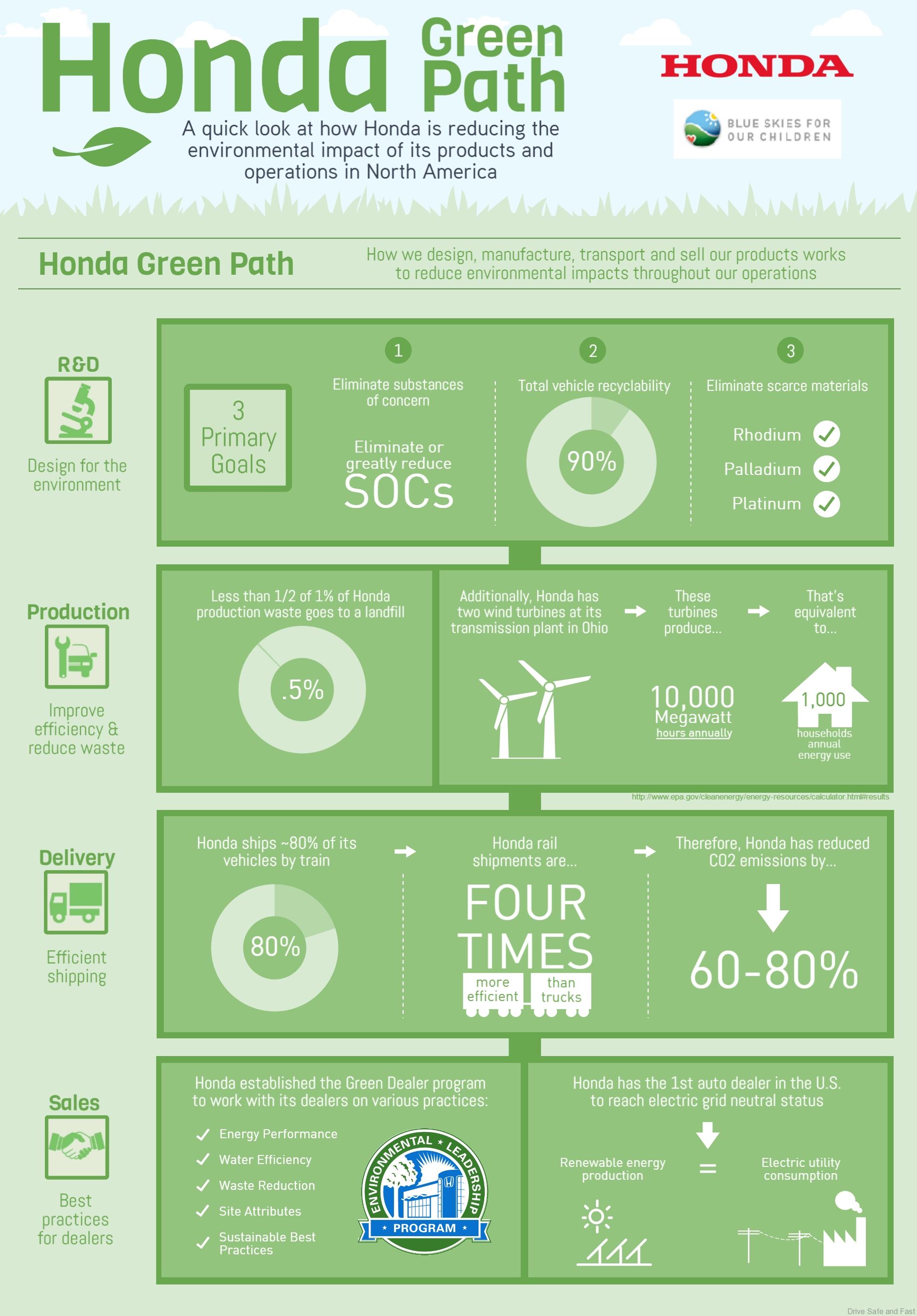 Honda’s “Green Path” approach, announced during a media tour of its operations in Ohio, seeks to reduce or eliminate the use of substances of concern (SOCs) and scarce natural resources in the design of its vehicles, significantly reduce the CO2 intensity and water use of its manufacturing operations, continue to decrease CO2 emissions from the transportation of vehicles from its plants to dealers, and expand the involvement of U.S. Honda and Acura dealers in its “Green Dealer” program.