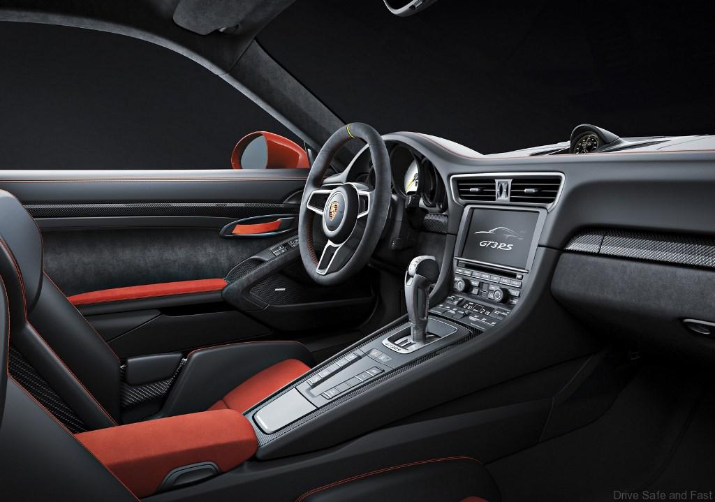 The interior design of the 911 GT3 RS with Alcantara elements is based on the current 911 GT3. Another key feature are the sports seats, which are now based on the carbonfibre ‘bucket’ seats of the 918 Spyder super sports car. Other standard features are the Club Sport Package with a bolted-in roll cage behind the front seats, preparation for a battery master switch, and a separately provided six-point safety harness for the driver and fire extinguisher with mounting bracket.