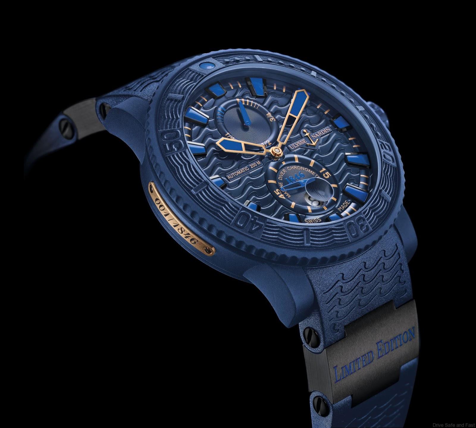 Resolutely anchored in aquatic sports, the brand new Blue Ocean from Ulysse Nardin Marine Diver collection is designed to tackle extreme conditions. It perfectly combines its dual function as a diving instrument and beautiful watchmaking piece. Its stainless-steel case has been specially treated with a sophisticated vulcanisation process giving it a blue rubber coating with a remarkable appearance and a truly comfortable feel. Its exhibition caseback reveals the self-winding movement also blued.