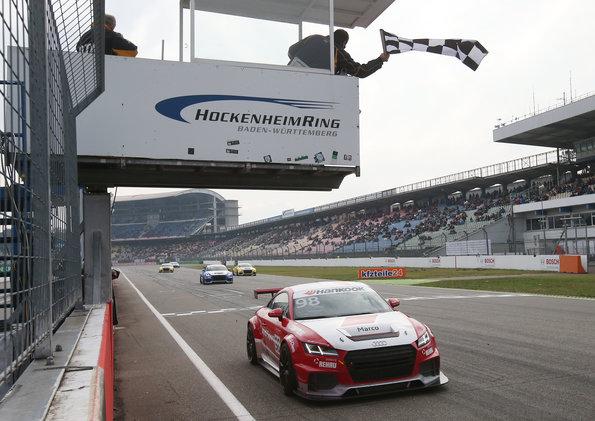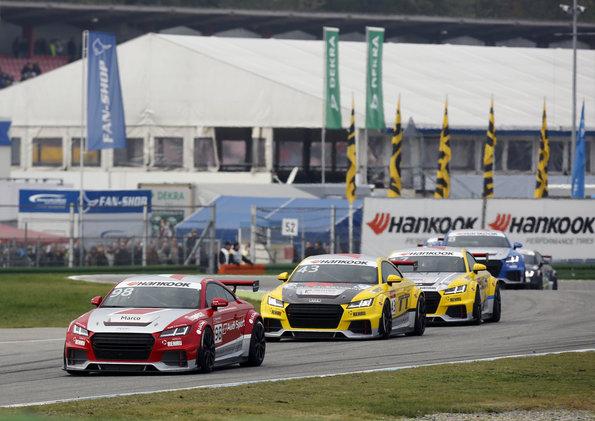 Position battles, overtaking maneuvers and suspense up to the end – the season finale in the Audi Sport TT Cup was superb advertising for motorsport and the crowning conclusion of the successful inaugural season. During the race, six drivers at the top were battling for victory, with the lead changing several times. Ultimately, Marco Bonanomi prevailed. With his experience, the 30-year-old Audi factory driver kept his rivals at bay. Following his teammate René Rast, who triumphed in round one at Hockenheim, the Italian is the second guest driver in the Audi Sport TT Cup to see the checkered flag in first place.