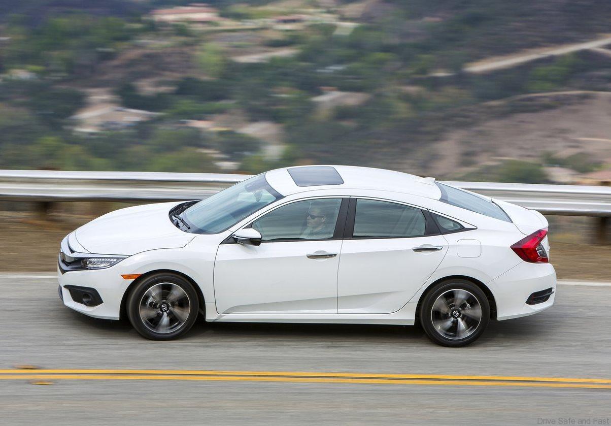 In a first for the market segment, all 2016 Civic trims incorporate a wide range of light-emitting diode (LED) exterior lighting features, including standard LED daytime running lights (DRL), LED one-touch turn signals, and LED taillights, brake lights, license-plate light and center high-mounted stop light. Additionally, the Touring trim receives new Honda LED headlights in an in-line configuration and side mirror-mounted LED turn signals.