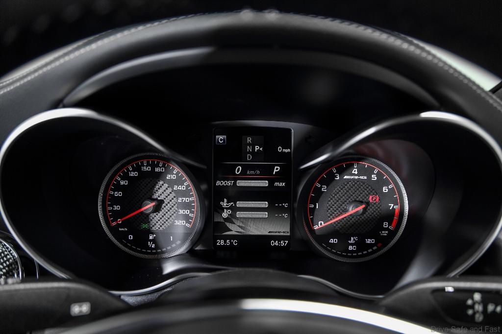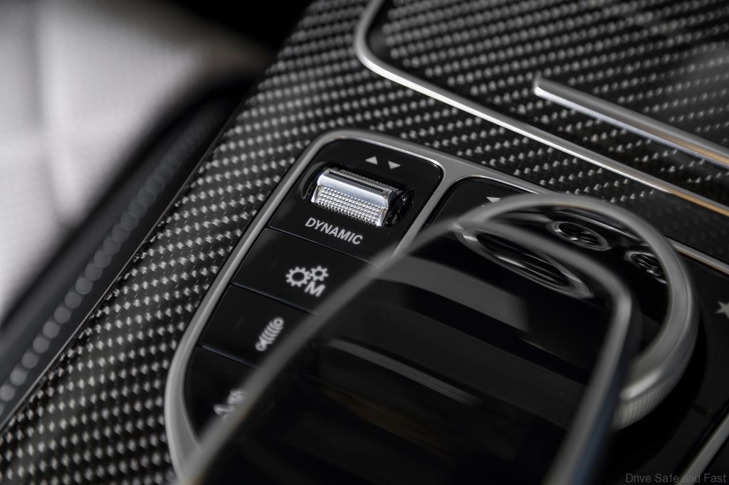 A sporty and dynamic ambience is also ensured by the 3-spoke Performance steering wheel with a 12 o’clock marking and by the instrument cluster. The model-specific dial faces in carbon-fibre look feature technically sophisticated through-lighting, the speedometer reads up to 320 km/h. The digital speed and currently engaged gear are shown in the multifunction display. The driver also has a variety of AMG menus available which can be activated using the steering wheel buttons: