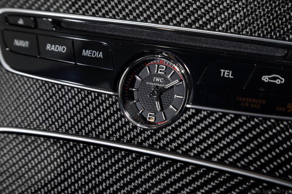 The dashboard is lined with black ARTICO man-made leather with topstitching in crystal grey, while the wing-like aluminium trim element and the AMG-specific analogue clock in IWC design accentuate the high-quality impression. The touchpad is flanked by the AMG DYNAMIC SELECT switch and numerous AMG-specific controls such as the button for the 3-stage Ride Control sports suspension, the manual transmission mode, 3-stage ESP® or optionally the button for the Performance exhaust system with flap control.
