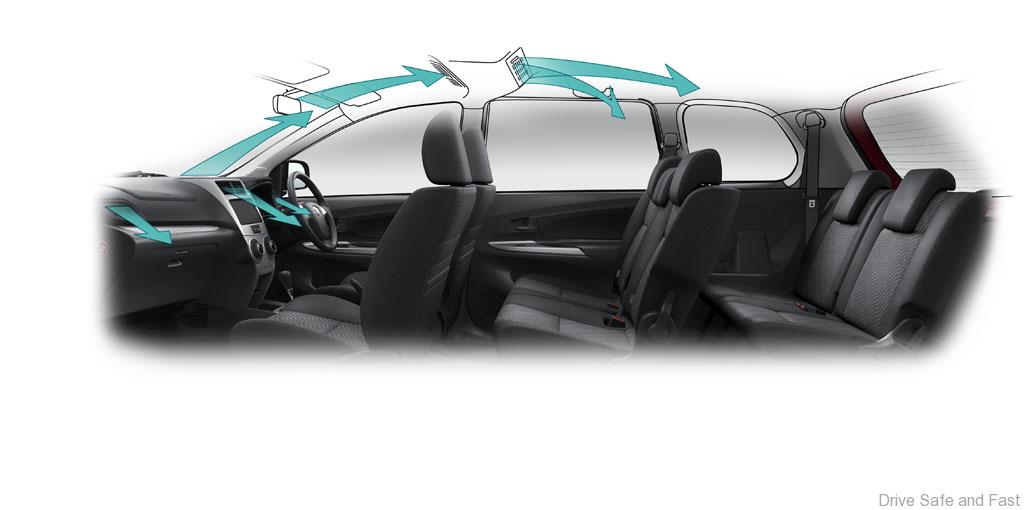 There is plenty of storage space provided around the cabin with bottle holders incorporated in the front and rear door pockets. The driver’s area also has enhanced storage spaces and there is more space on the centre console for small items. This will be welcome as people carry various devices nowadays and need a place to keep them. Every effort has gone into providing a comfortable atmosphere for all the occupants to enjoy their journey in the new Avanza. The dual-blower air-conditioning system with independent rear blower adjuster and additional vent located on top of the dashboard directs cool air towards the intake of the ceiling-mounted blower to enhance its cooling performance. The airflow reaches the rear end of the cabin to ensure the passengers in the third row will be comfortable.