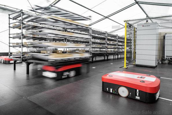 A fleet-management system coordinates the carries so that they always arrive at the commissioners’ workplaces punctually. This means that the employees never have to wait for their goods – a shelf change at the picking station takes just four seconds. The robots receive the order to bring a shelf for commissioning by Wi‑Fi. When in motion, they orient themselves by means of QR codes on the floor, which are read by a camera installed under the DTS. The autonomous transport systems move in a separate area from where the employees work.