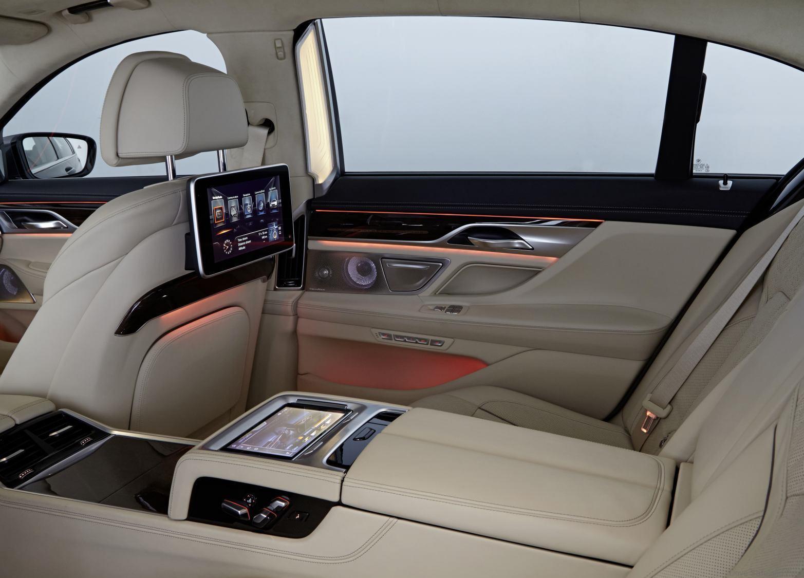 The Executive Lounge Seating (expected July 2016) provides a superlative standard of travel comfort in the rear seat behind the front passenger seat. The backrest can be reclined to an angle of up to 42.5 degrees. To offer the passenger in the rear even greater legroom, the front passenger seat can be slid forward by an extra 90mm and its backrest tilted all the way forward. For a completely unobstructed view to the front, the head restraint can be folded down as well. An electrically operated fold-out footrest can also be found on the back of the front passenger seat. The rear-seat entertainment system screen can be electrically adjusted to the ideal viewing angle for the rear passenger’s current seat position. In addition to all this, the Executive Lounge rear console also features a fold-out table, two cupholders and a storage compartment, as well as the new BMW Touch Command unit.