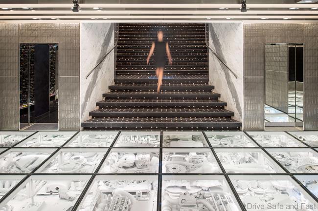 INTERSECT BY LEXUS – DUBAI is composed of two floors. The lower floor features a garage and exhibition space for Lexus concept vehicles and art installations, while the upper floor provides a lounge, a restaurant, a library lounge, and a shop for CRAFTED FOR LEXUS lifestyle items.