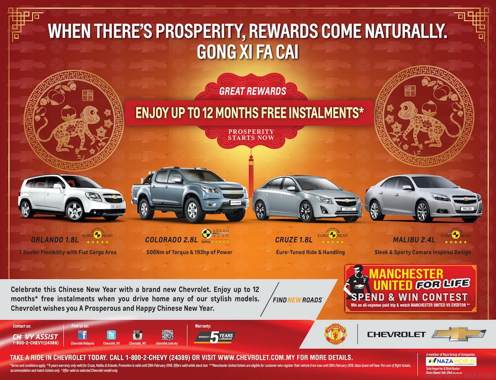 The 2016 CNY promotion also entitles customers to great rewards with savings of up to 12 months free instalments (terms and conditions apply) when they purchase any Chevrolet model. Chevrolet is also offering a service campaign promotion in conjunction with the CNY festive season. Current Chevrolet owners are encouraged to visit any of the authorised service centre for a free 40-point inspection check, free MDI diagnostic scan and free 1-year