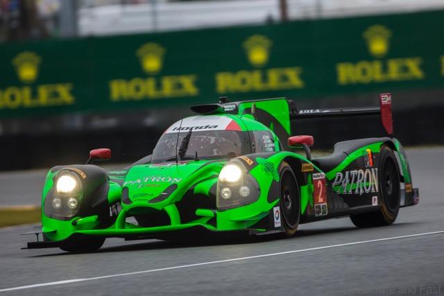 Starting on the outside of the front tow, Derani took the lead at the green flag, but soon fell back behind both the similar Ligier-Honda of Michael Shank Racing and the unique DeltaWing, which led much of the opening two hours. As night descended, the DeltaWing was eliminated by damage from contact with a stalled car, and the race developed into a contest among the pair of Ligier-Honda’s and a half-dozen rival Daytona Prototype teams. Starting third, Michael Shank Racing and drivers A.J. Allmendinger, Oswaldo “Ozz” Negri, John Pew and Olivier Pla moved their Honda-powered Ligier to the front for the first time at the two-hour mark with Pla at the wheel. Negri and Allmendinger also took turns at the point, as the MSR Ligier-Honda led for a total of 99 laps in the first eight hours. However, mid-way through the ninth hour, engine failure ended the race for MSR.