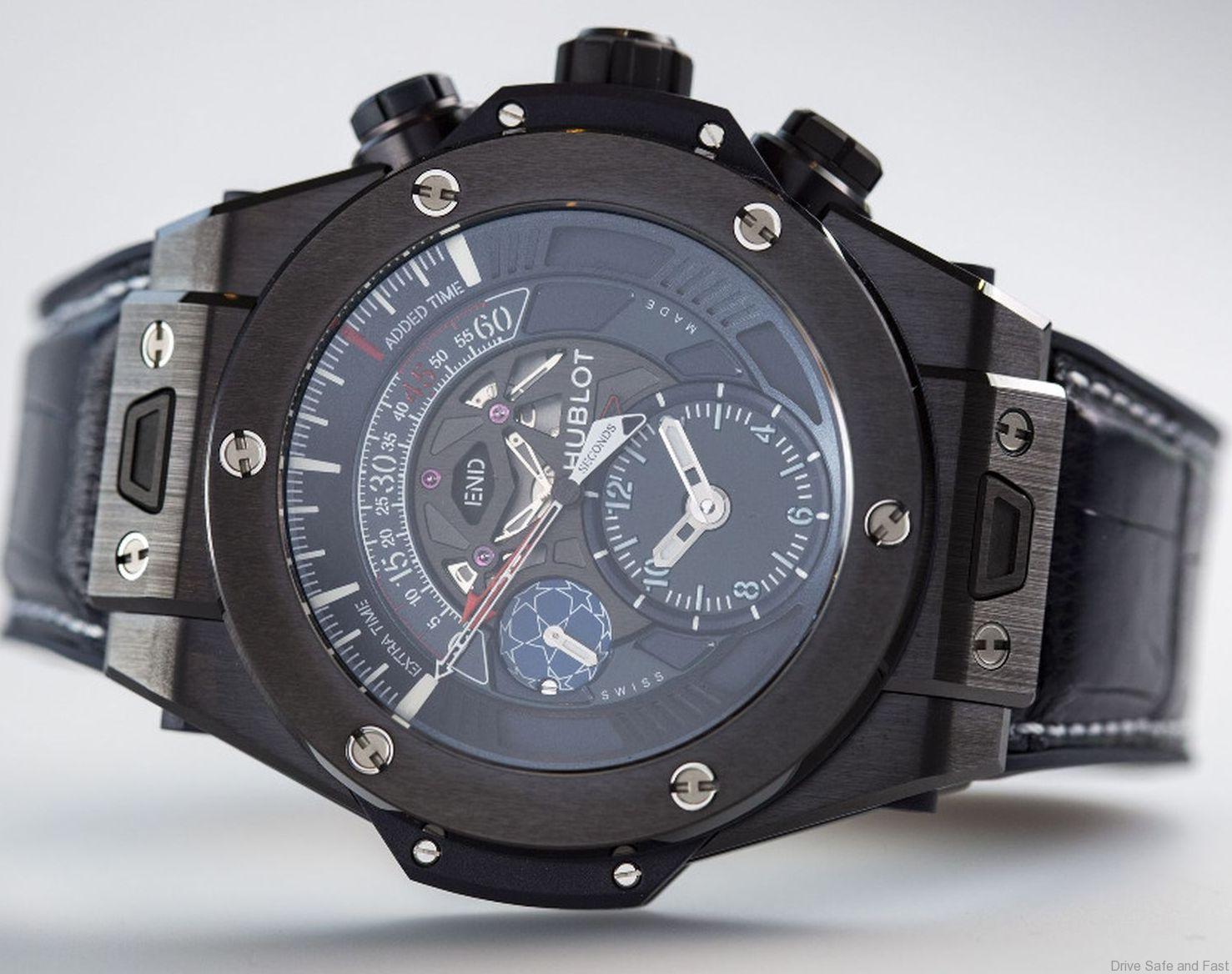 The HUB1261 movement is visible through a sapphire case-back finished with the UEFA Euro 2016™ or UEFA Champions League™ emblem. A bi-retrograde module with patented automatic winding is fitted to the UNICO manufacture calibre, enabling it to time a football match. Designed to time two halves of 45 minutes, and extra time, allowing a total of 60 minutes, its central chronograph display has the seconds and minutes hands moving on a circular arc between 10 o’clock and 2 o’clock. A push button at 2 o’clock activates the mechanism and moves the second hand to the 60-second mark before it swiftly jumps back to 0 and starts again, whereas the minute hand measures elapsed time as it moves around. The aperture in the centre indicates the ongoing period (1 — first half/ ½ break / 2 —second half, END – end of the game). As for the local time, this is displayed by a counter at 6 o’clock.