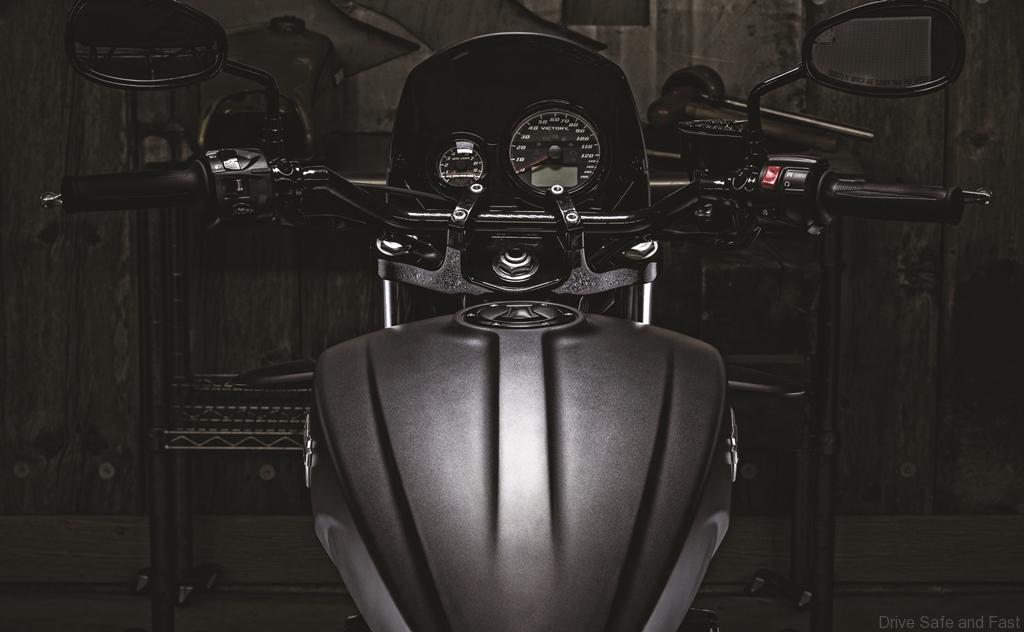 There are no smooth, flowing lines here. Octane is the most aggressive Victory motorcycle ever built, and the styling has been revised to suit with harder lines, sharper creases, a more-pronounced center spine and other details that make Octane look leaner and meaner than any American motorcycle ever before. The bullet cowl is standard equipment and screams to oncoming traffic that this bike is built for speed—the only thing other riders are going to see is the LED taillight disappearing into the distance. Chrome won’t get you home, so there’s hardly any shiny stuff on Octane. The bulk of the chassis, running gear and powertrain are blacked-out, and Matte Super Steel Gray bodywork looks all business. Even the tank badge has been cast in gray instead of the traditional Victory red to create a modern, monochrome look.