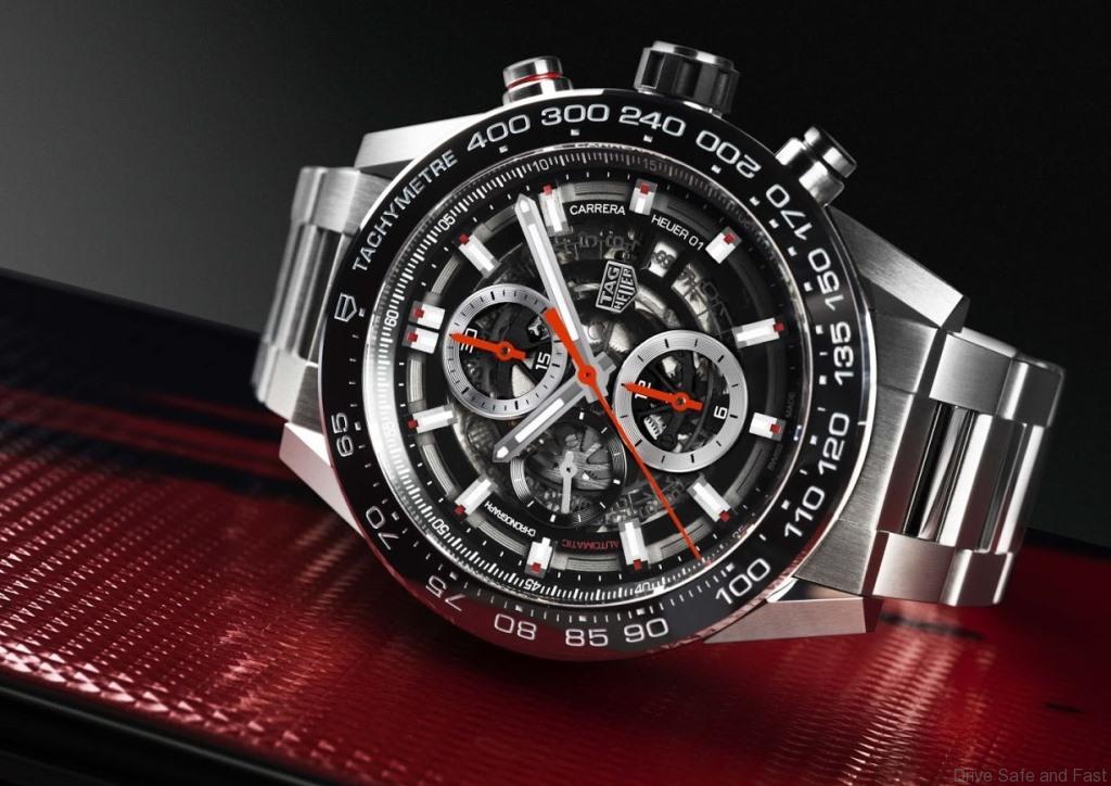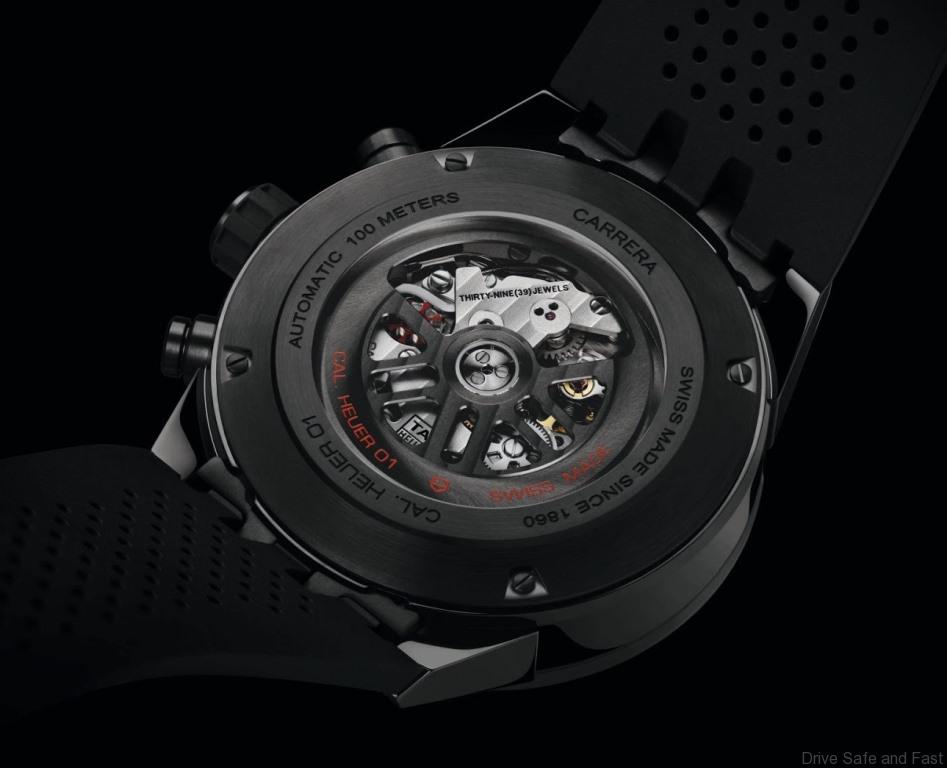The dial bears the inscriptions “CARRERA HEUER-01” and “CHRONOGRAPH” in white letters, and “AUTOMATIC” in red or white letters