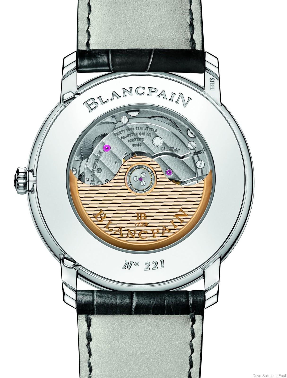 The case is fitted with Blancpain’s exclusive patented under-lug correctors. The ingenious idea behind this system was to place the correctors under the lugs so that they can be operated by hand without any need for a correcting stylus, as well as remaining hidden from sight when the watch is worn. The one at 1 o’clock enables simple manual adjustment of the day of the week; while the other at 5 o’clock adjusts the month. Fast GMT and date corrections, along with time-setting, are all handled via the crown.