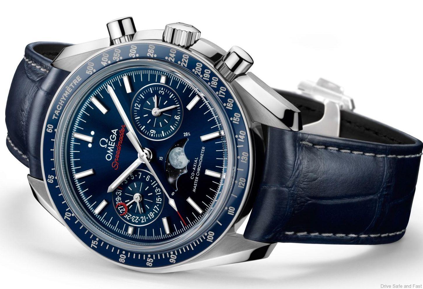 This new Speedmaster Moonphase wristwatch comes with a blue leather strap featuring a foldover buckle.