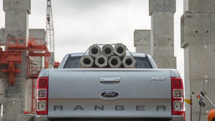 The new Ranger was subjected to a punishing day at the job site, with pallets of wood, concrete tubes, bags of cement and stacks of steel dropped from 2.6 meters above the truck bed to test the outer limits of the Ranger’s load box.