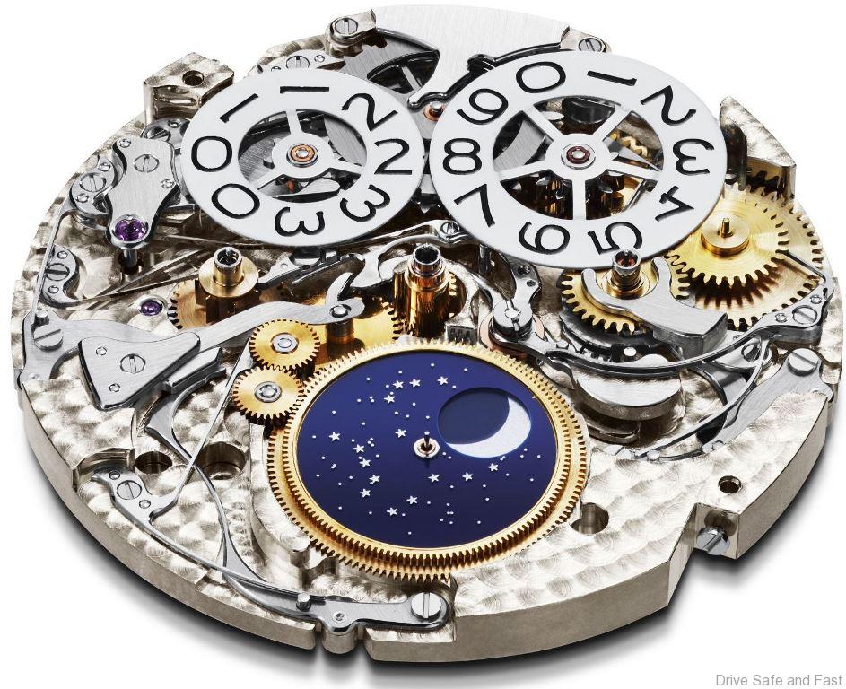 This calendar is recognisable by its large twin-aperture date display, complemented by indications of the day and whether or not it is a leap year, while the finishing touches are set by a day/night indication and an orbital moon-phase display. The latter guarantees graphic and accurate readings of the age of the moon, with a mere one-day deviation in 122 years.